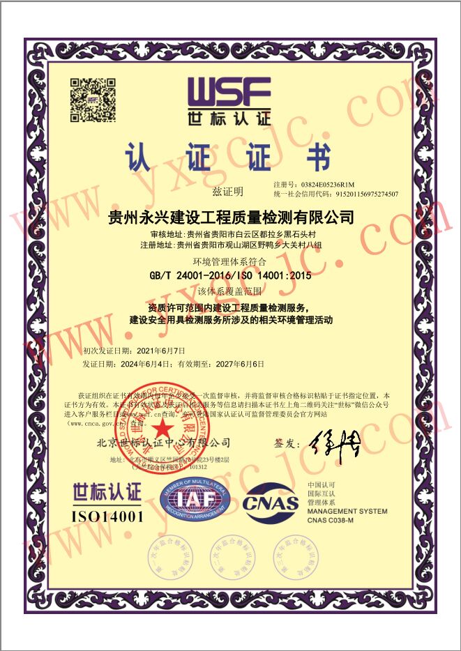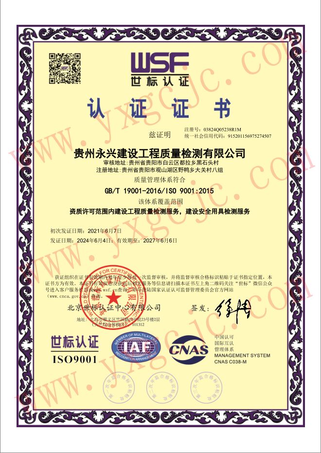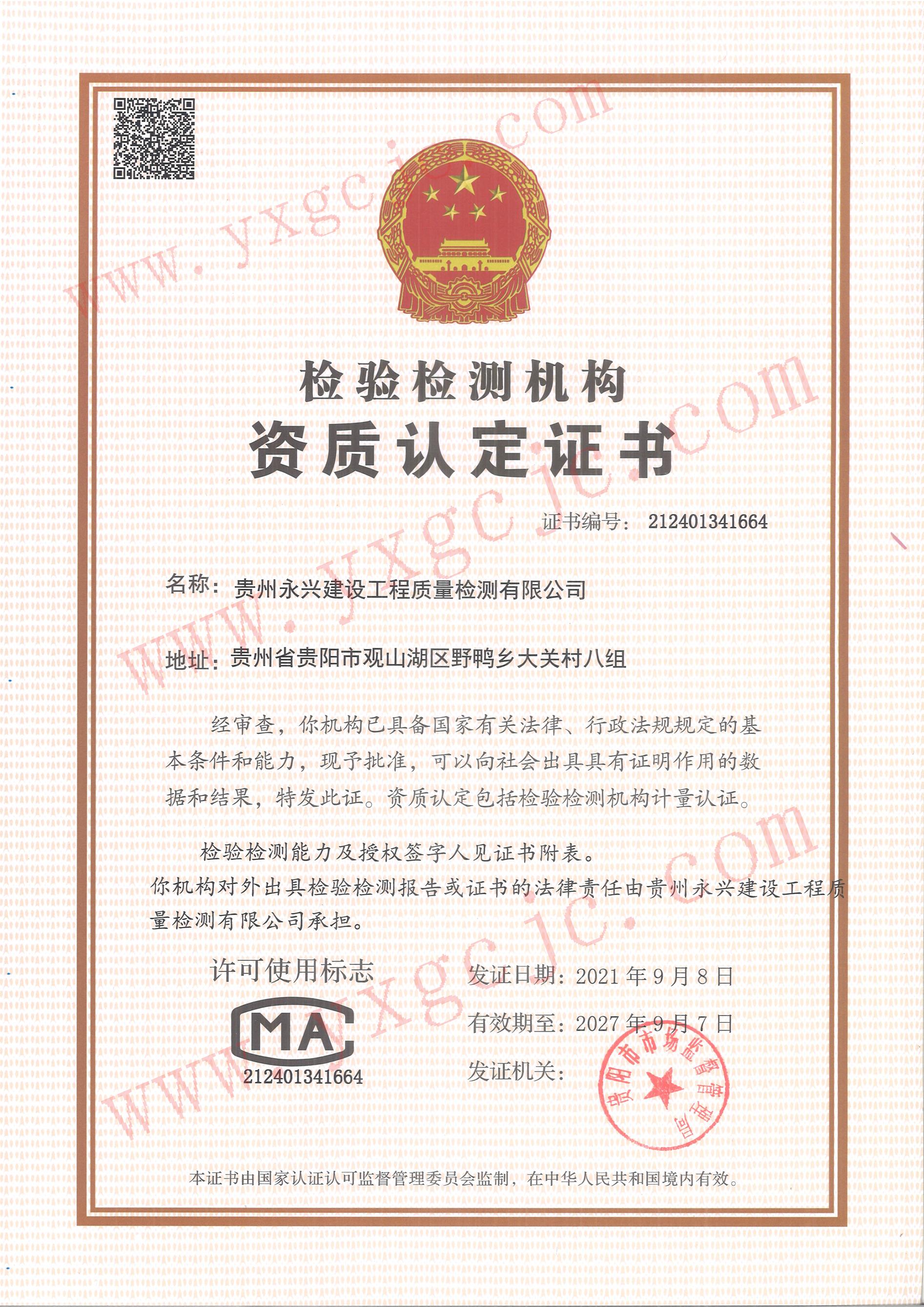 貴州永興建設工程質量檢測有限公司成立于2009年12月21日,主要承接房建、市政、鐵路、公路工程質量檢測業務,并開展新技術、新材料、新工藝的研究開發與推廣應用。公司取得的資質有:建設工程質量檢測(見證取樣、地基基礎、主體結構、鋼結構、門窗幕墻、室內環境)、公路工程試驗檢測、工程勘察、雷電防護裝置檢測。公司通過檢驗檢測機構資質認定批準檢測項目156項、檢測參數1422個,公司還通過了質量管理、環境管理、職業健康安全管理體系認證。 ...